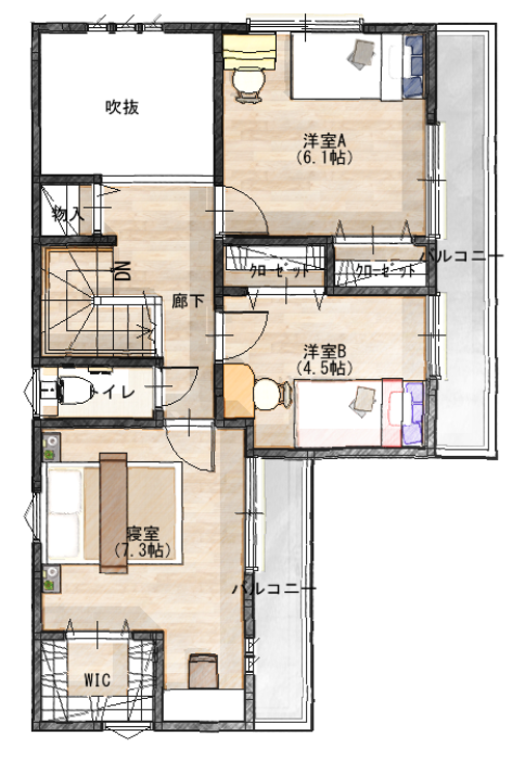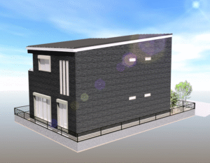 道路側には窓が少なく、プライバシー性を確保。一方でバルコニーや裏側の開口部は開放感あり。