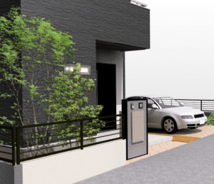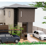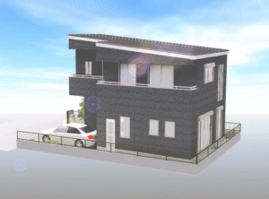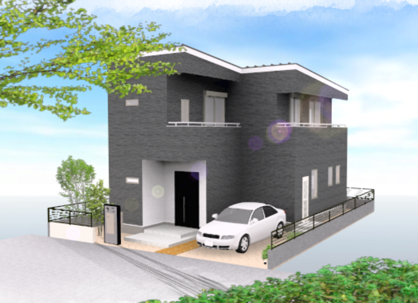 ダークグレーの外壁と直線的なフォルムがモダンで洗練された印象。