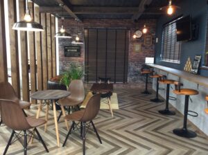 一方、カフェカウンターをイメージしたコミュニケーションスペースには、レンガ調の壁材と無垢材の天井梁、ペンダントライトを採用。