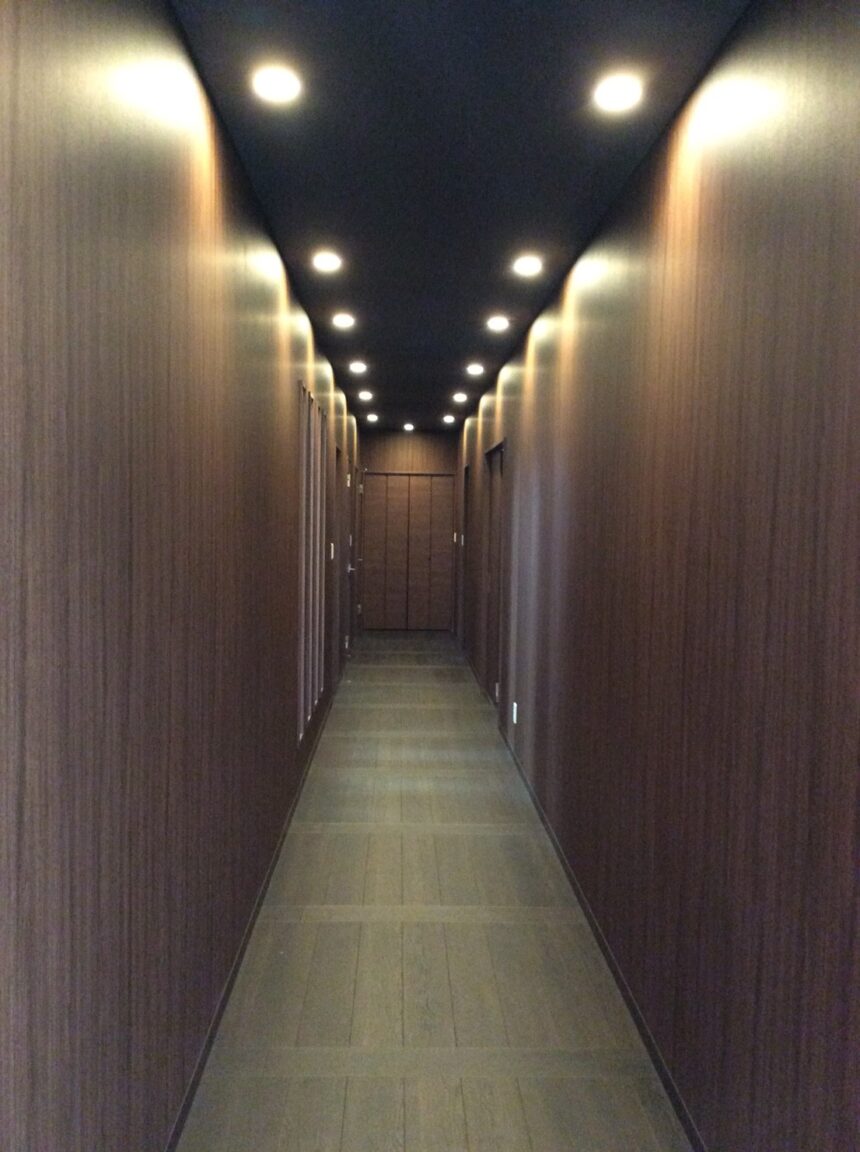 エントランスから奥へと続く廊下は、ウォールナット調の重厚な木目で統一。